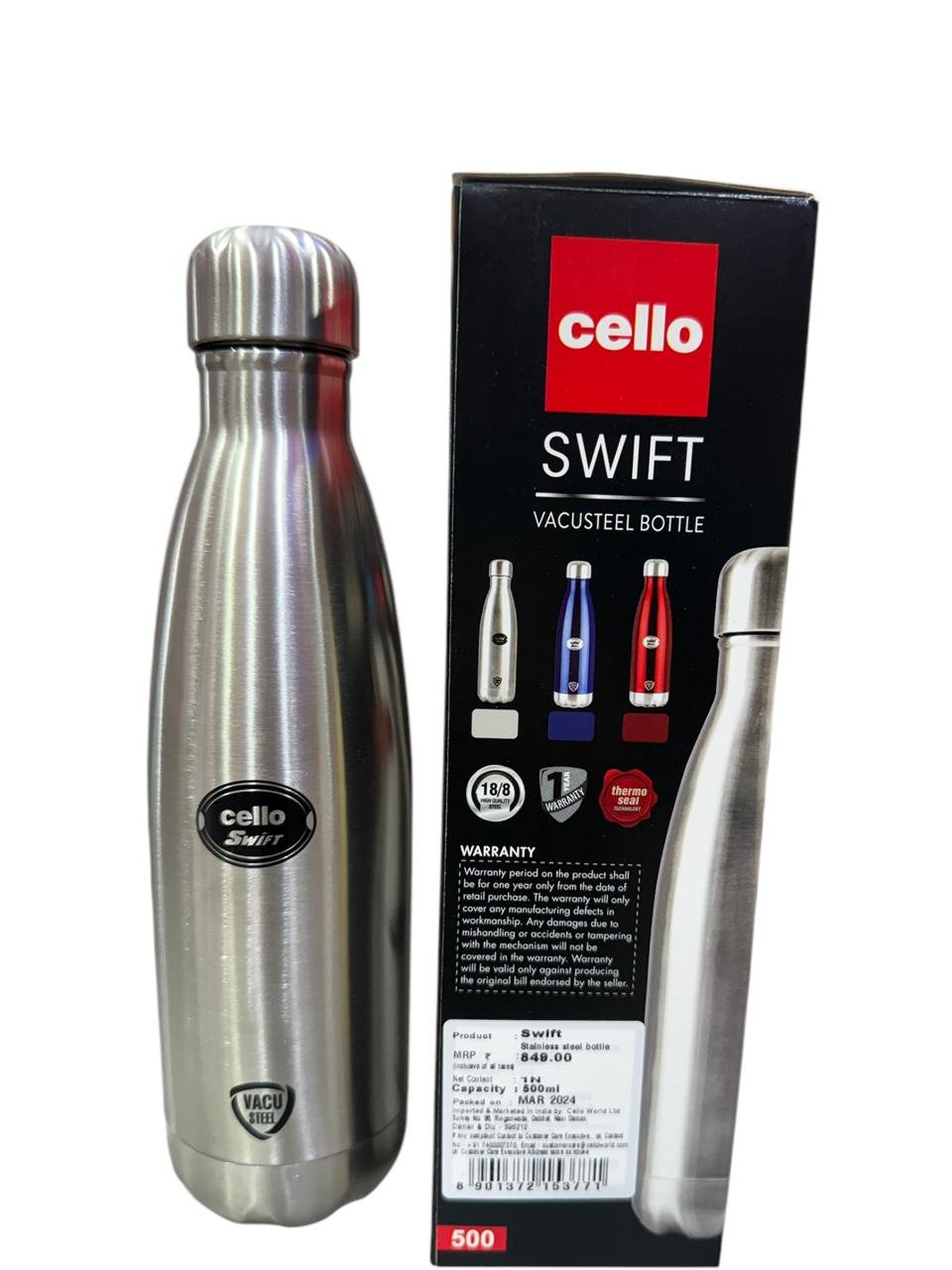 Stay refreshed on the go with the Cello Swift Vacusteel Bottle, the ultimate companion for your active lifestyle. Featuring advanced double-wall vacuum insulation, this sleek and durable bottle ensures your beverages stay hot or cold for hours, so you can enjoy your drinks just the way you like them